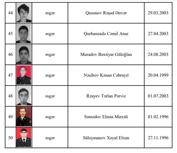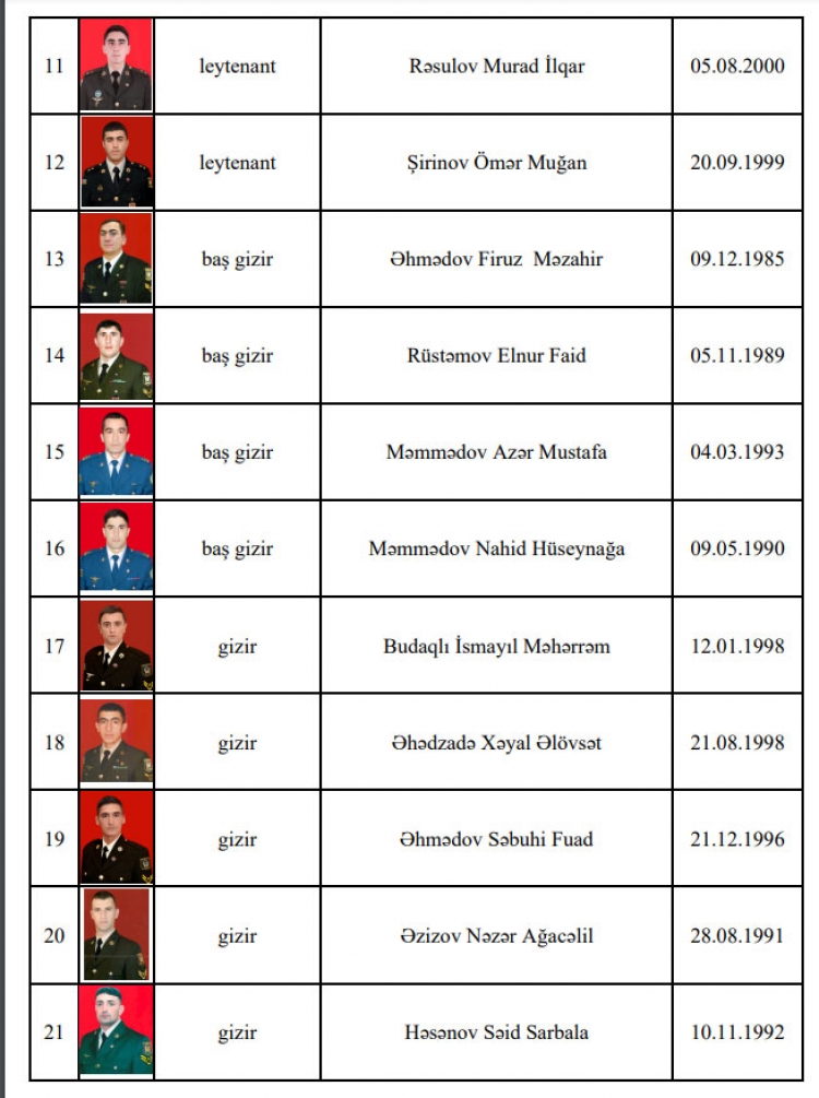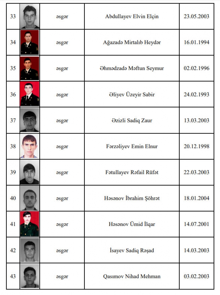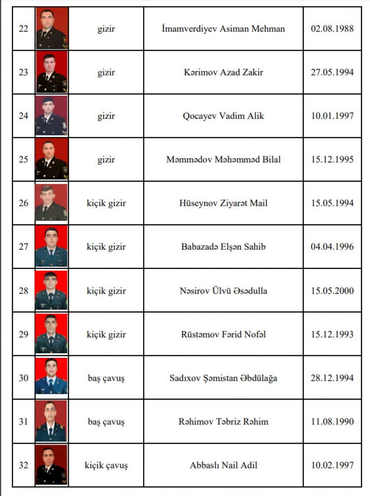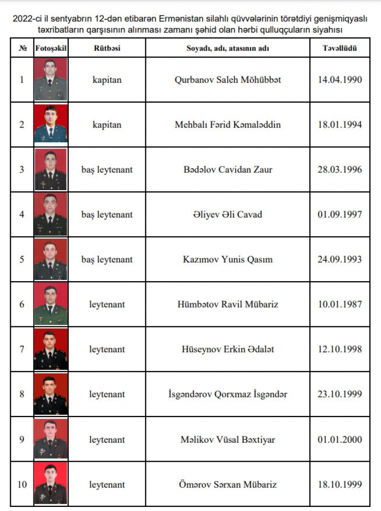 Azərbaycan Müdafiə Nazirliyi Ermənistan silahlı qüvvələrinin törətdiyi təxribatların qarşısının alınması zamanı şəhid olan hərbi qulluqçuların siyahısını açıqlayıb. “Avronews” siyahını təqdim edir: